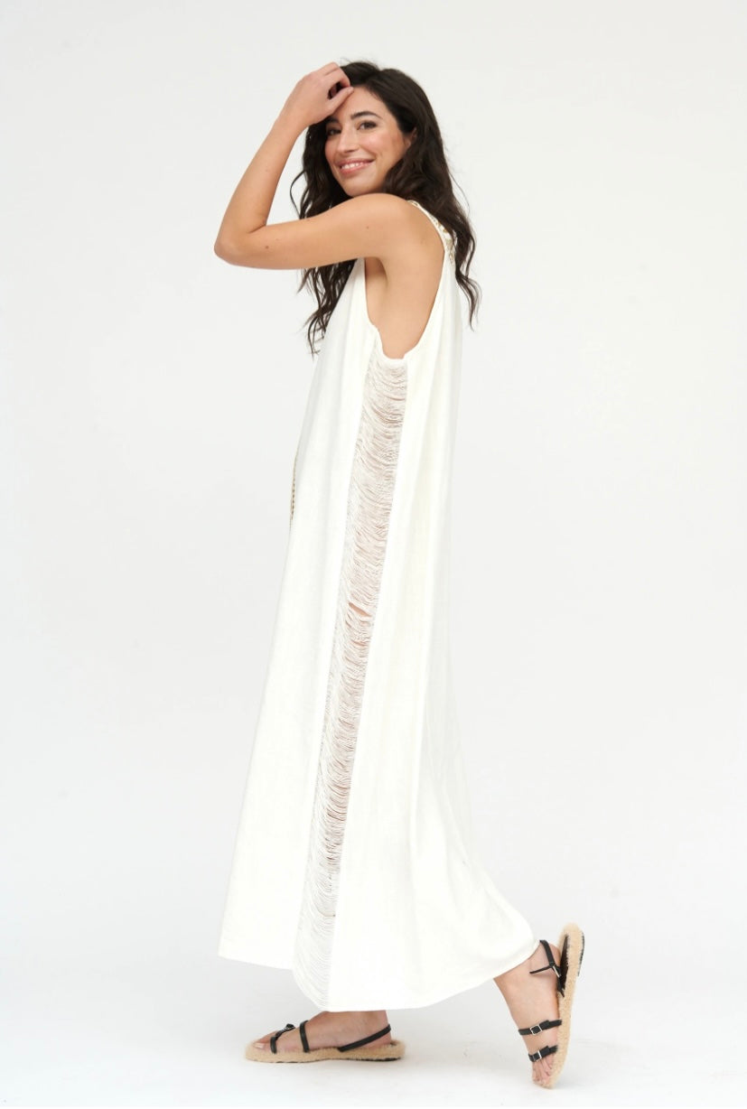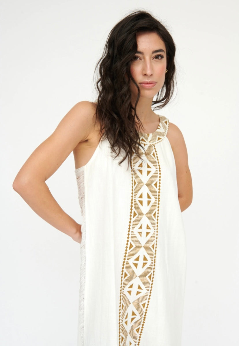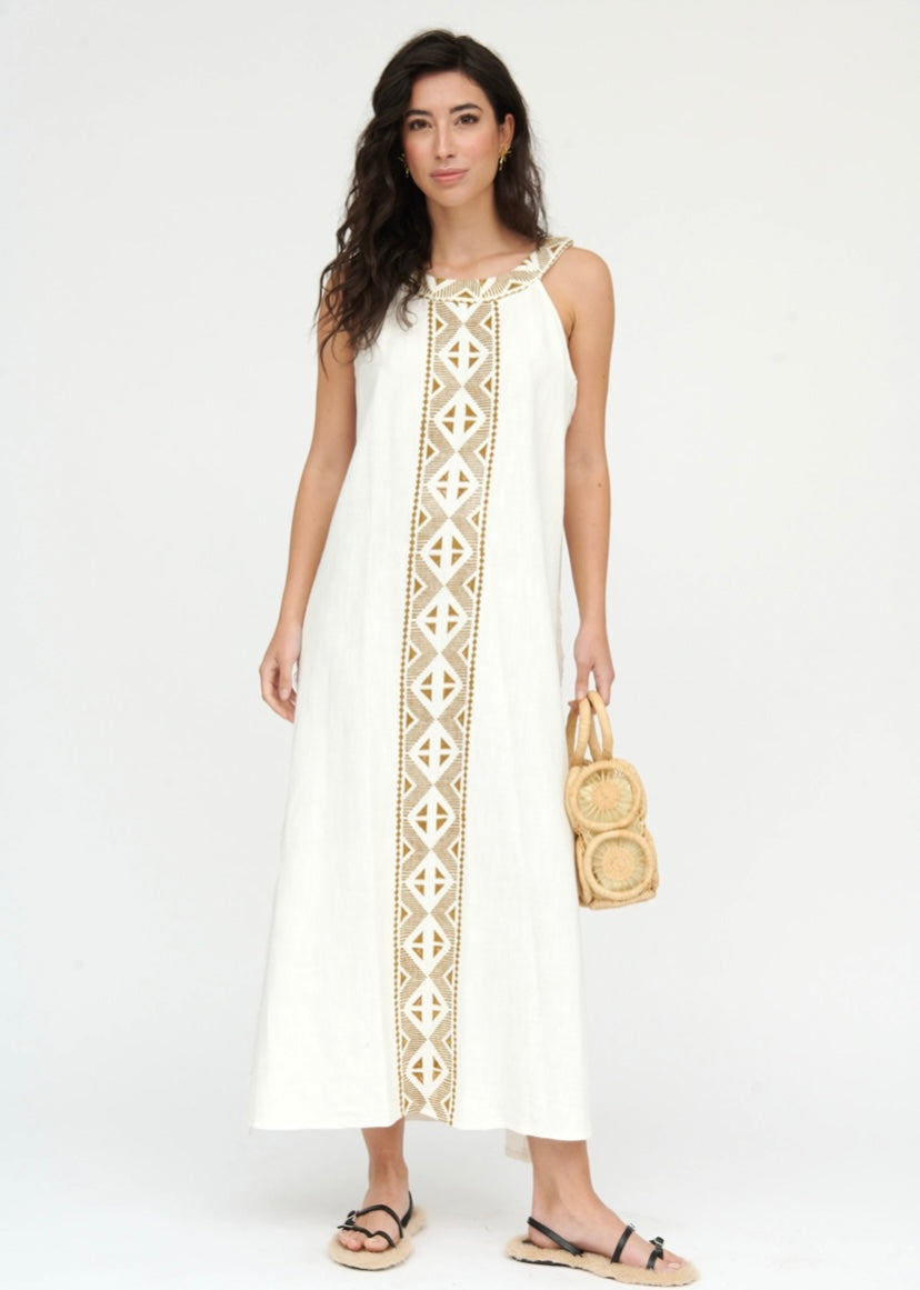 White Linen Dress with Aztec Print